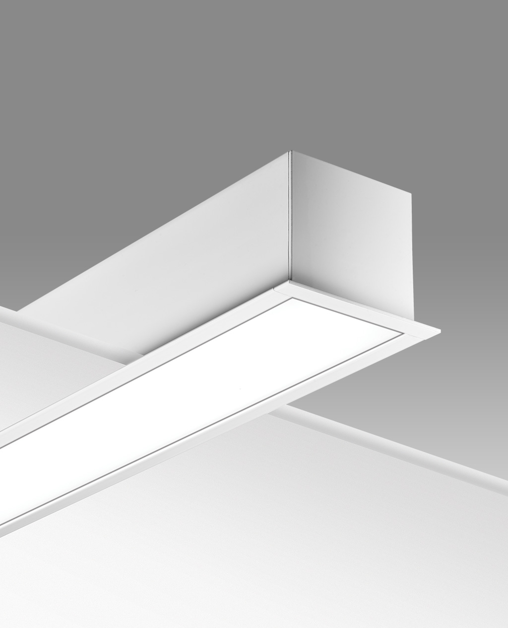 The recessed linear light model Line 90, featuring a minimalist design and LED light source, can be manufactured in custom lengths and is suitable for various applications including offices, education, retail, hotels, residential, and commercial spaces, with minimalist and modern designs.