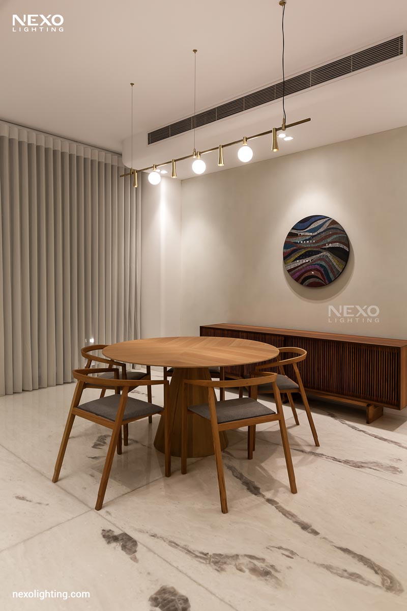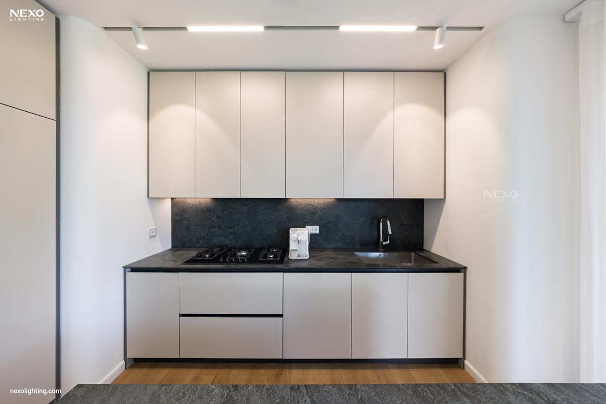 In the kitchen, “Verona” and “Unique” magnetic lights provide general and accent lighting, while “Flex Tube” luminaires is used for decorative illumination above the dining table.