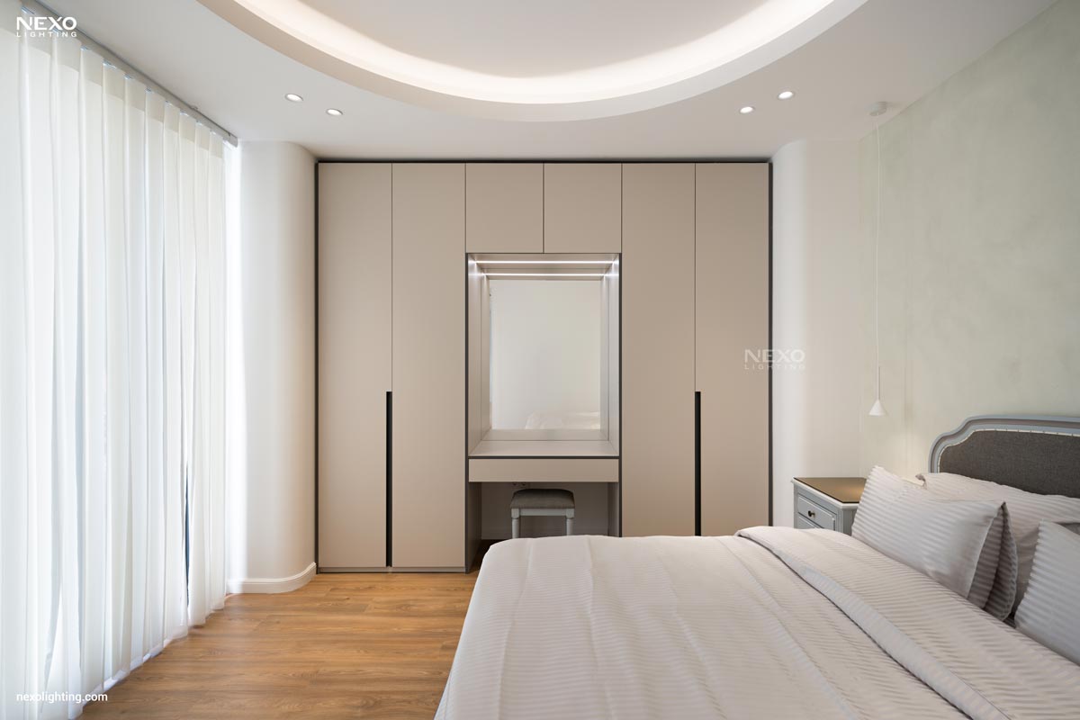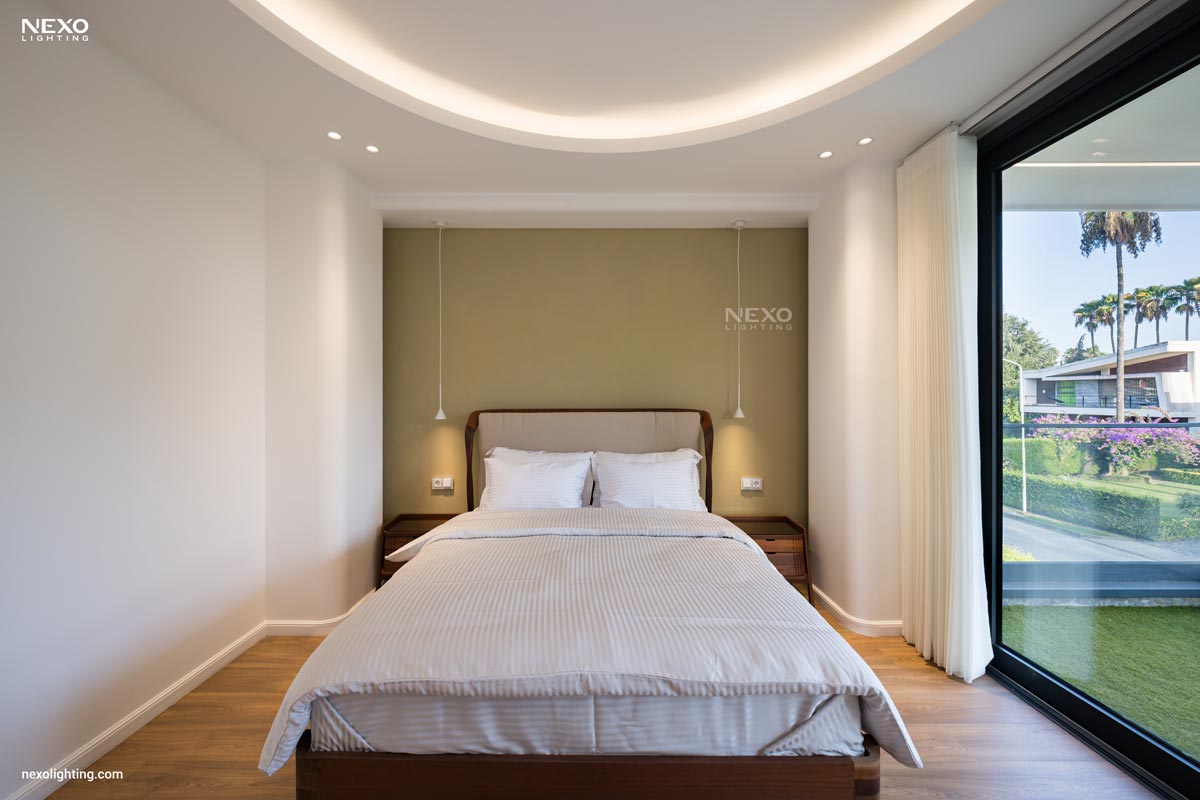 The bedrooms are designed with “Corner Line” luminaires for indirect linear lighting, “Duke” pendant luminaires on both sides of the bed to create a warm and relaxing atmosphere, and “Mellow” downlights for general lighting.