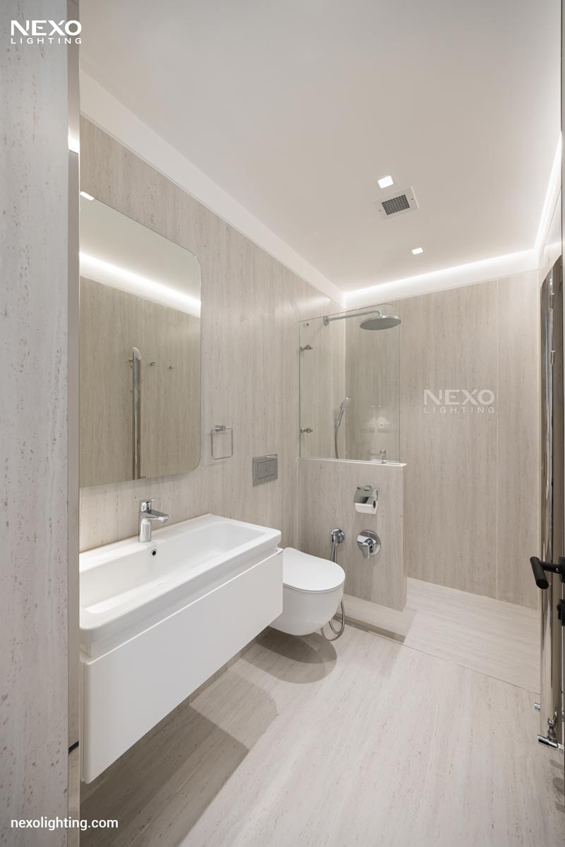 In the bathroom and restroom, indirect linear lighting using “Corner Line” luminaires alongside “Trimo” downlights for general illumination creates a modern and functional space.