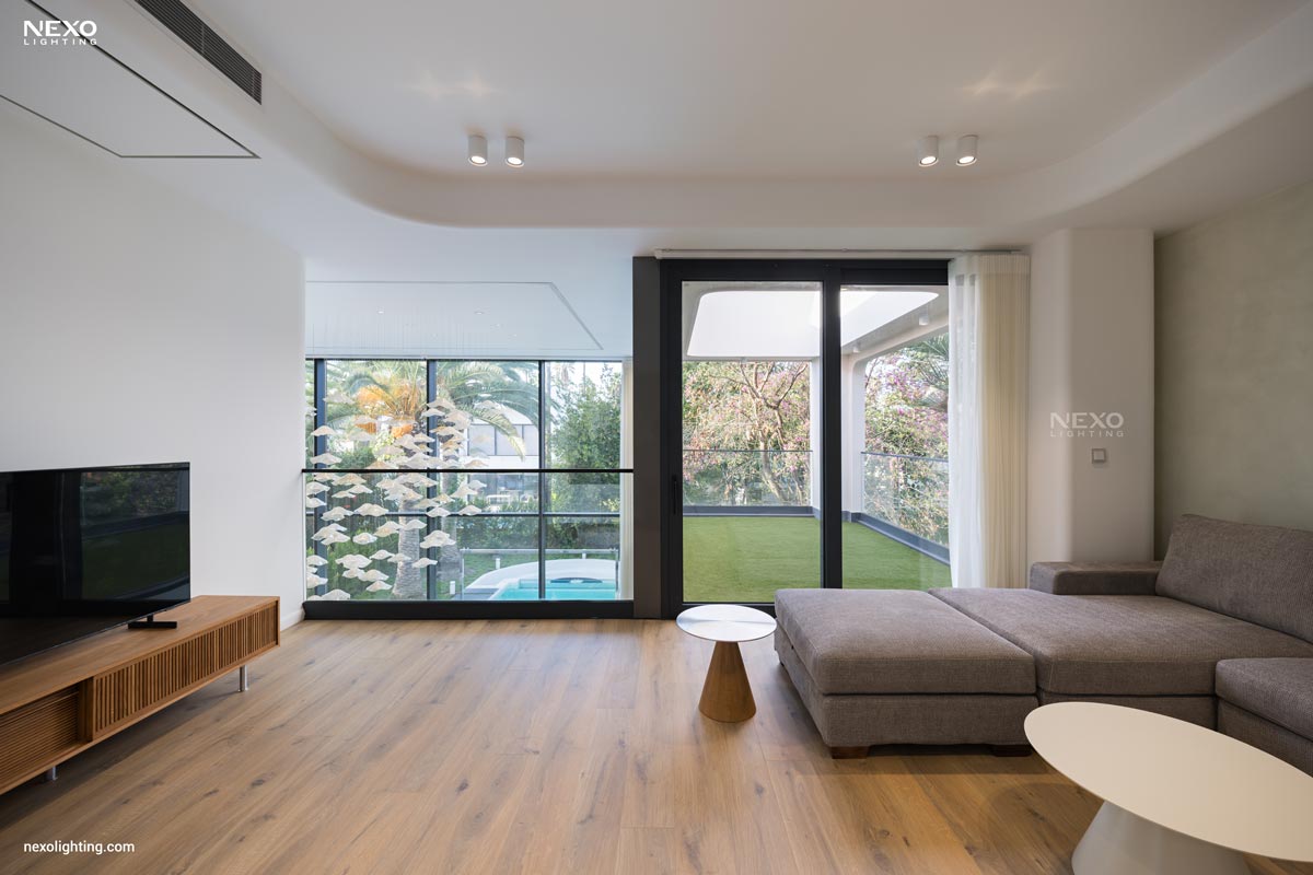 The living area features surface-mounted “Echo Plus” downlights for general lighting and “Unique” luminaires to highlight key elements.