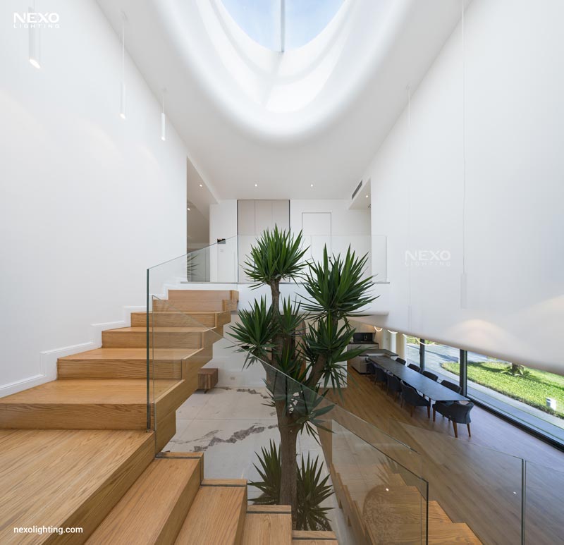 The staircase lighting, using “Silva” pendant luminaires along the path, provides adequate illumination while adding a visually appealing effect to the space.