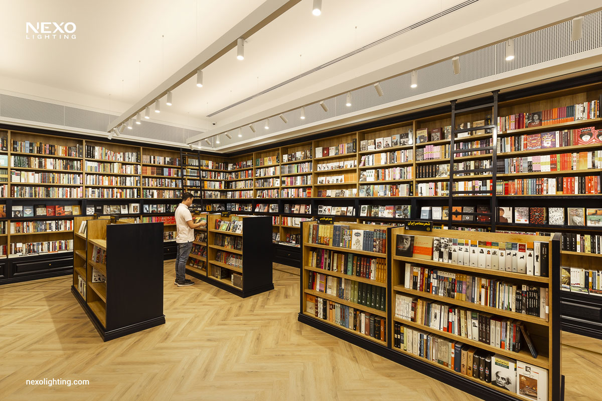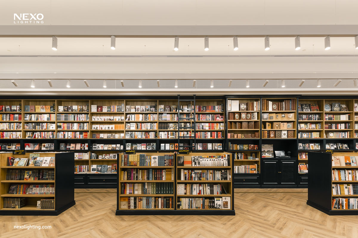 The lighting in the Bookland bookstore combines indirect illumination reflected from the ceiling with accent lighting from pendant linear fixtures, custom-designed and manufactured by NEXO, enhancing both comfort and visual appeal throughout the space.