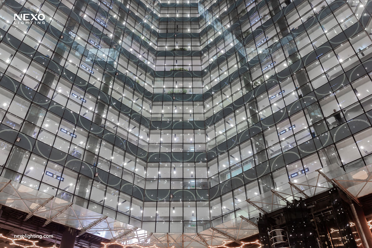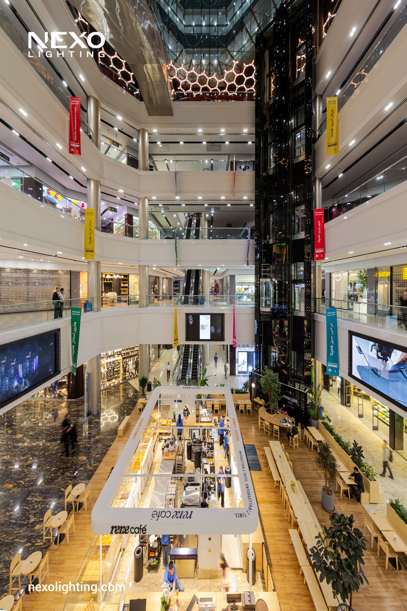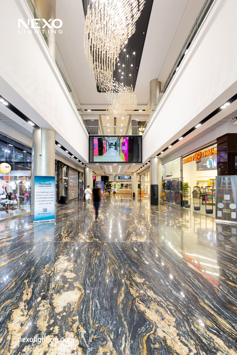 Hamila spans approximately 150,000 square meters and consists of 27 floors, accommodating a range of businesses and organizations. The complex includes commercial, administrative, and cultural units, a hypermarket, a modern amusement park, a food court, and a coffee shop, catering to all the essential needs of visitors. Interior lighting for the Hamila project includes Echo lights in recessed and surface-mounted modes, Linno lights in various diameters, and Linear lights manufactured by NEXO.