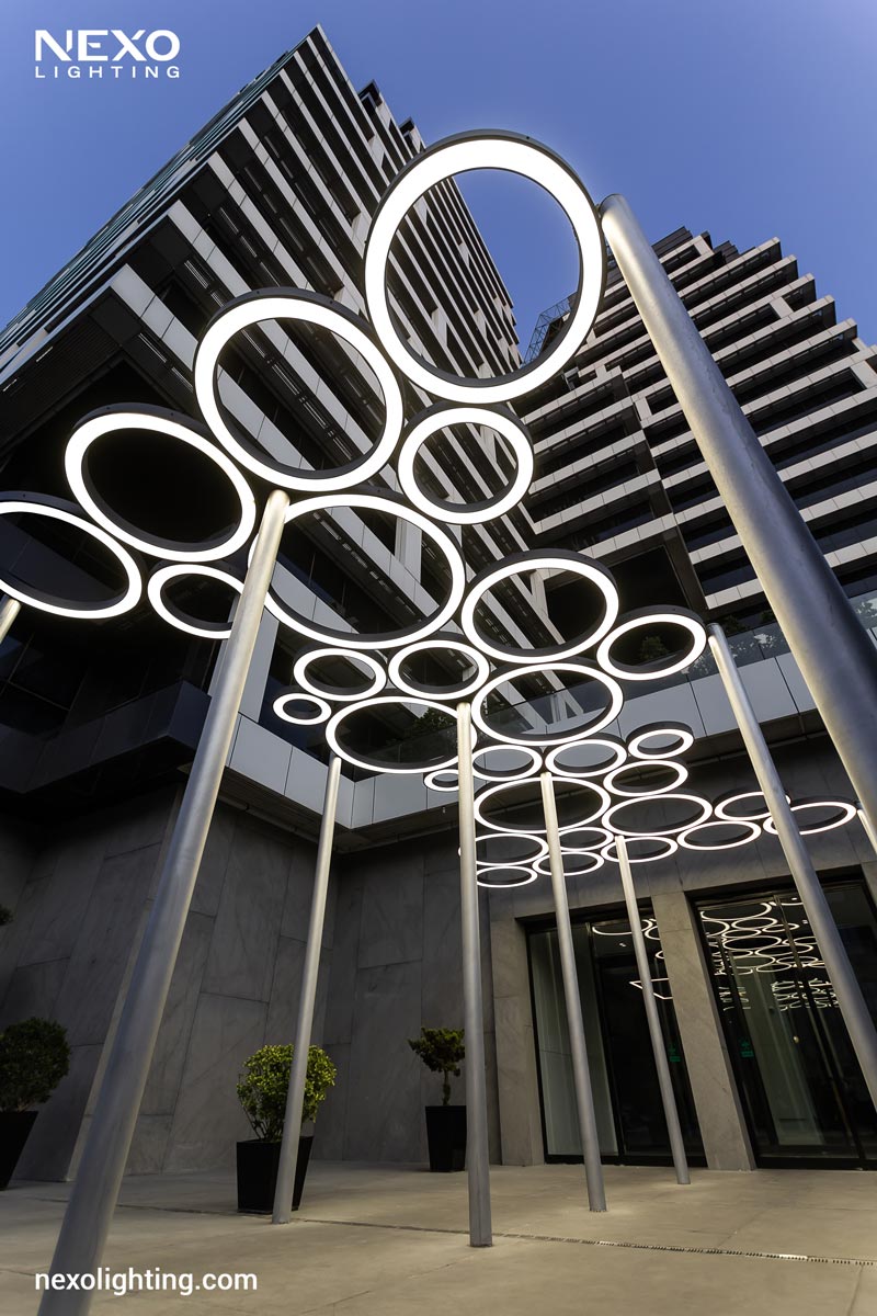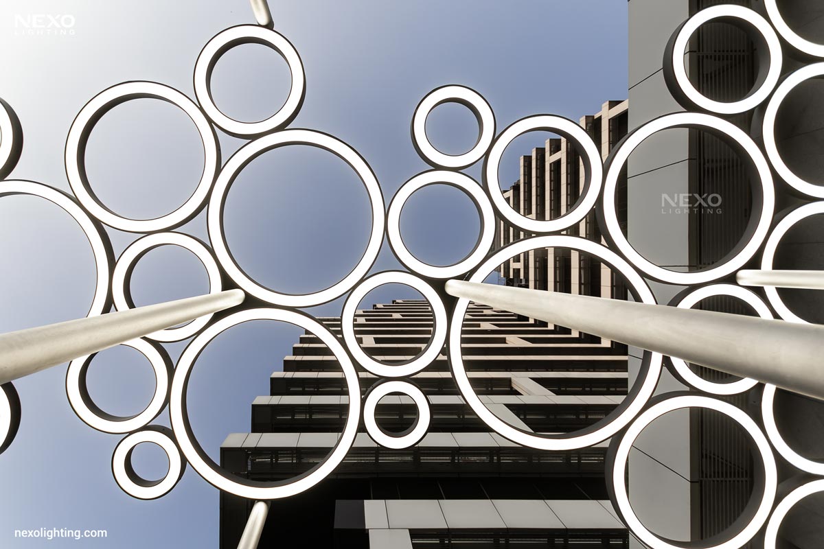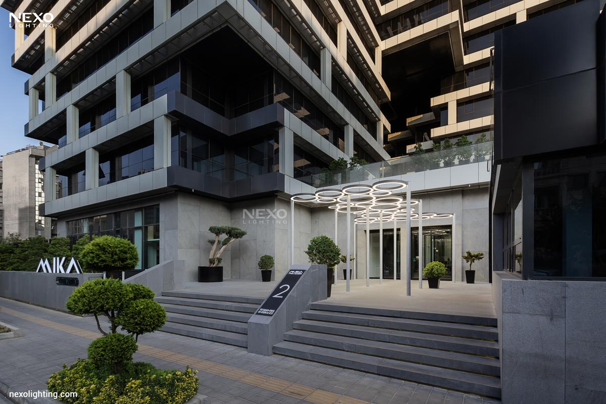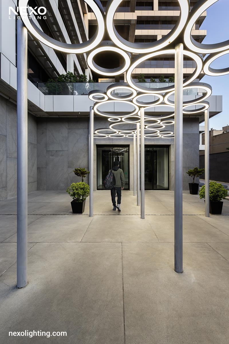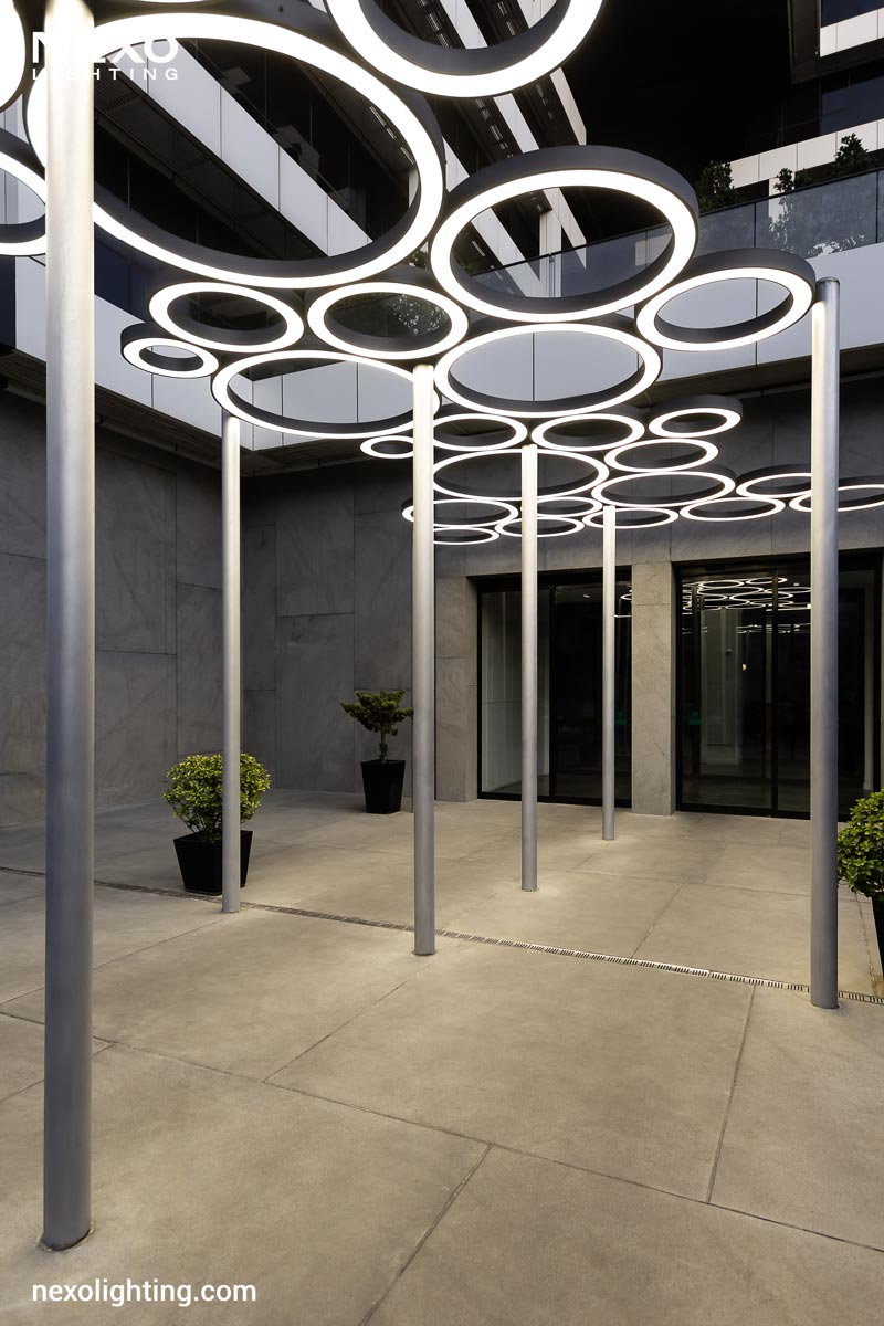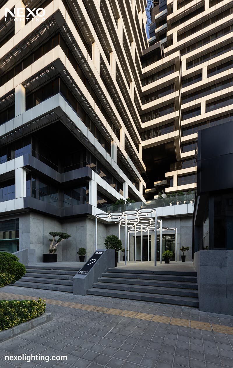 At the entrance area of this project, lighting has been implemented using customized fixtures with circular designs and patterns resembling interlocking rings. These lights not only provide a soft and uniform illumination, but through their unique installation also lend an artistic and modern touch to the entrance, creating a warm and inviting atmosphere for residents and visitors. The combination of light and form beautifully highlights the unique identity of this project, even at night.