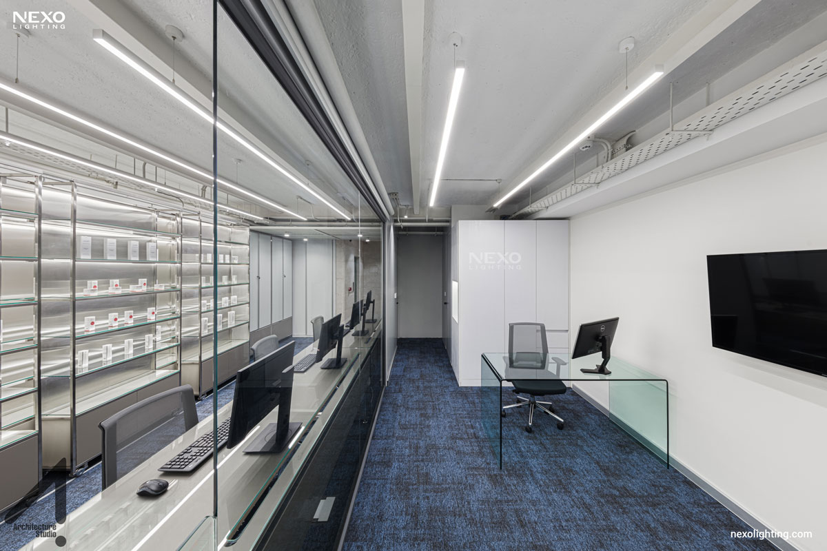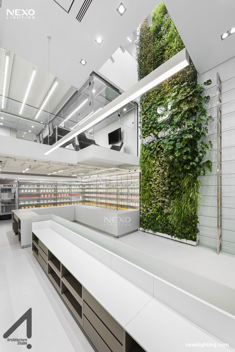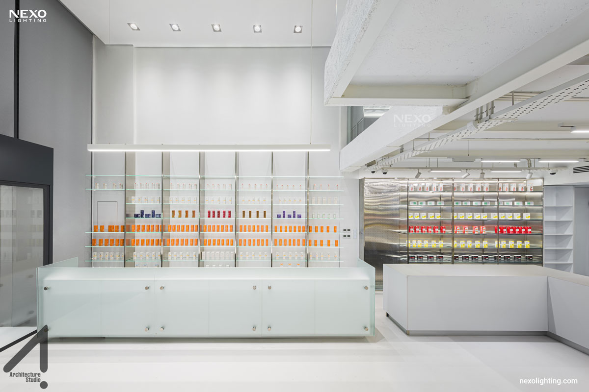 For the lighting design of the project, Manna ceiling lights have been used to provide general and ambient lighting, while linear pendant lights have been used to illuminate the counter. Additionally, the Multi Track system has been implemented to allow for flexible lighting, utilizing various magnetic lights (spot and linear) to illuminate the shelves and counter.
