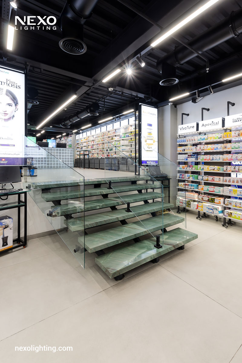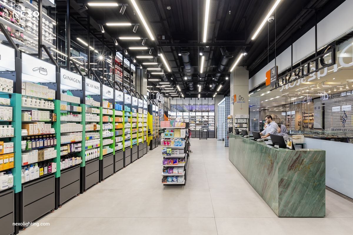 In the lighting design of this pharmacy, the NEXO Spot Line system has been implemented to create a balanced combination of accent and general lighting.