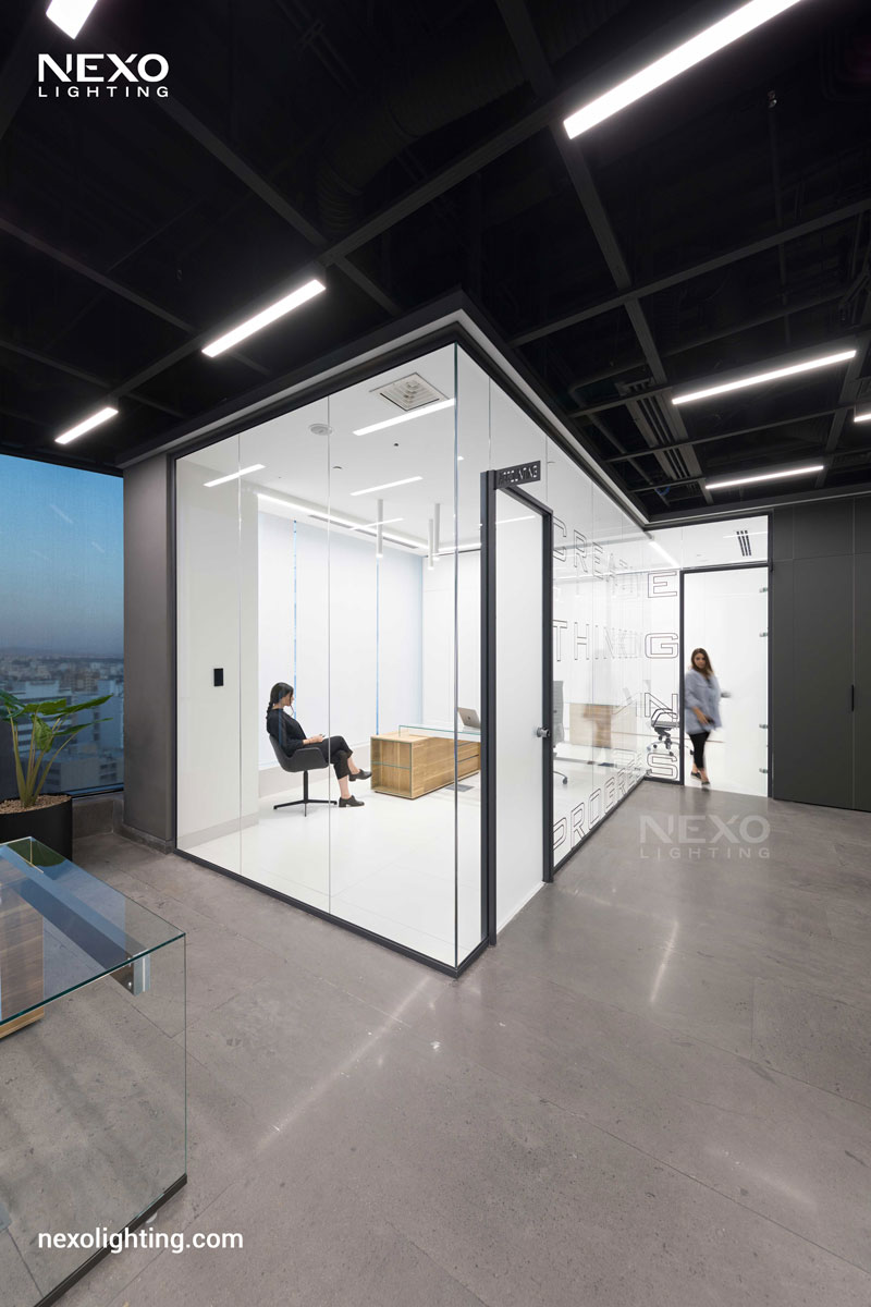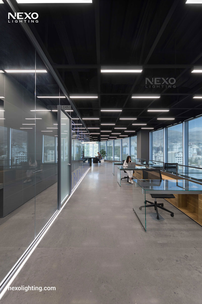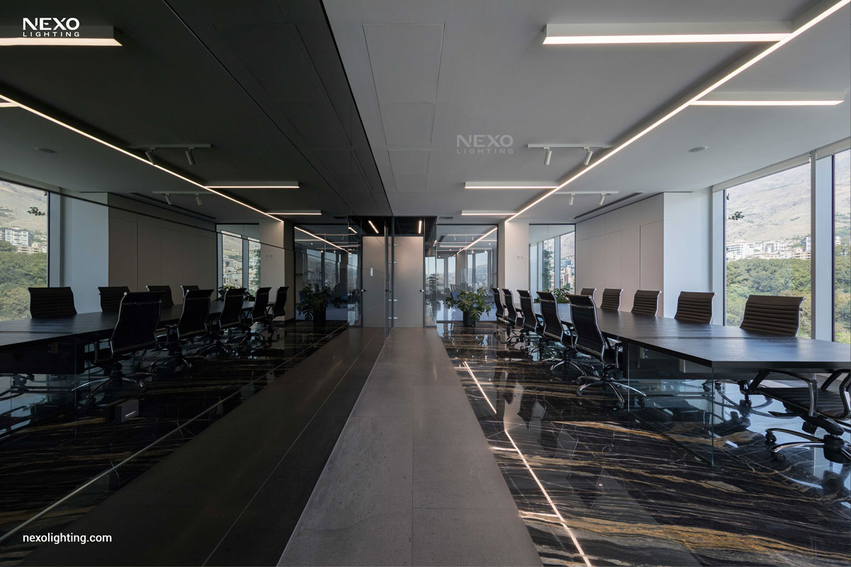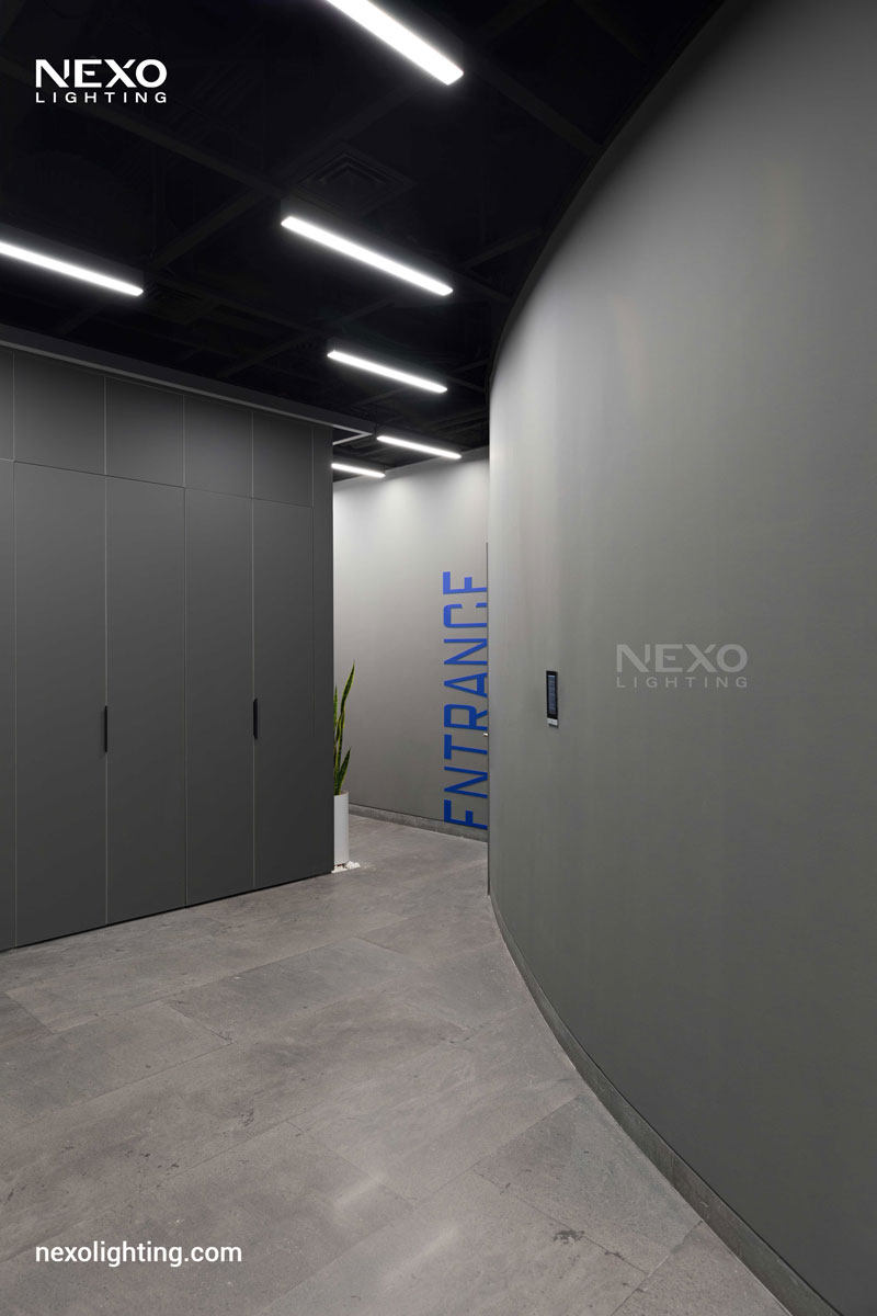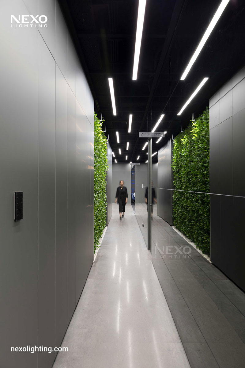 In this project, the ceiling lighting consists of partially linear lights, enhancing the spatial dynamics through their rhythmic placement. This effect is particularly pronounced around the central box and the main aisle, where the reflected lines amplify the design.
