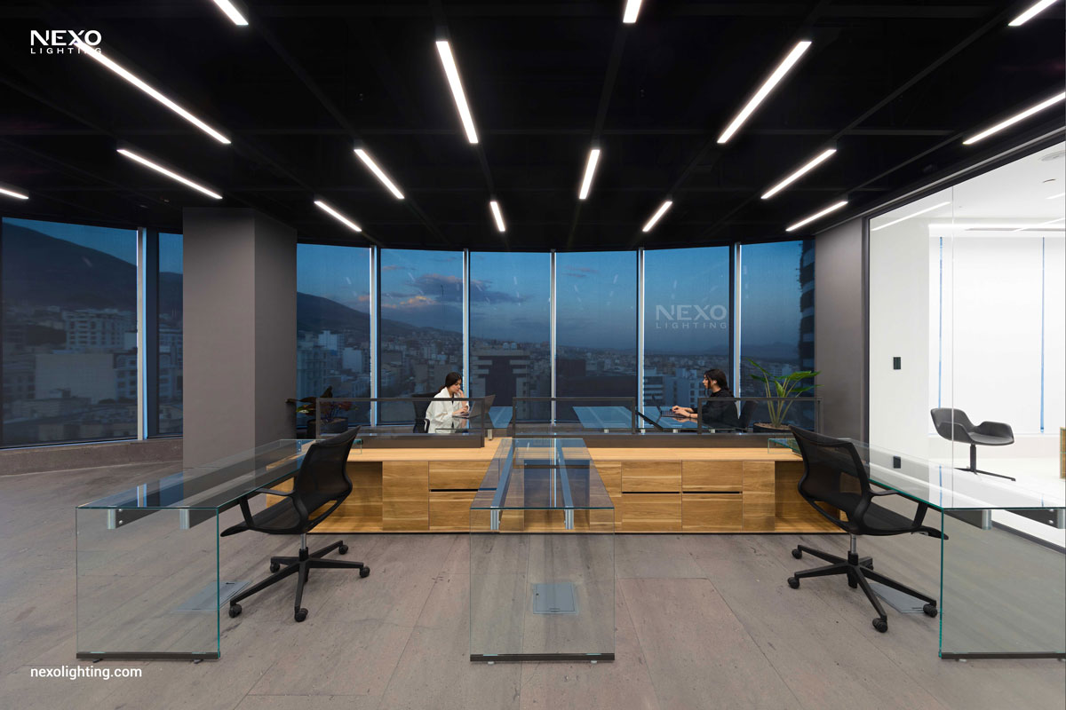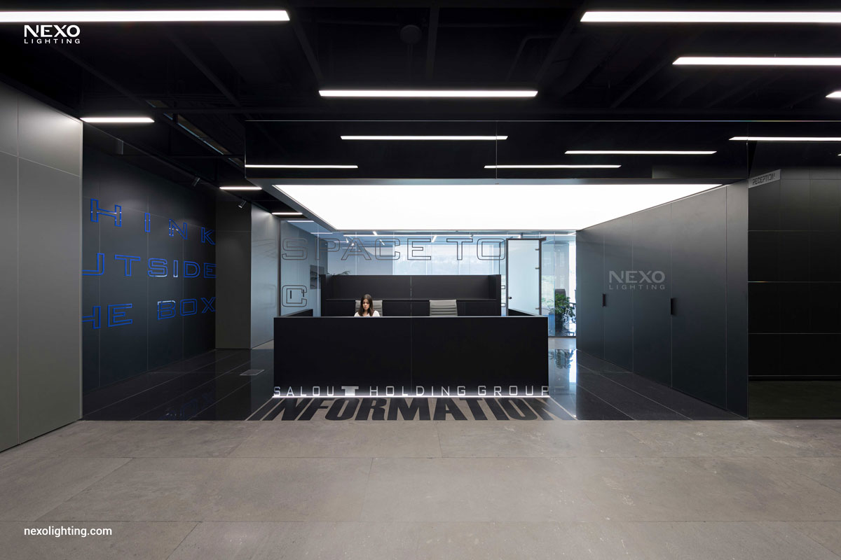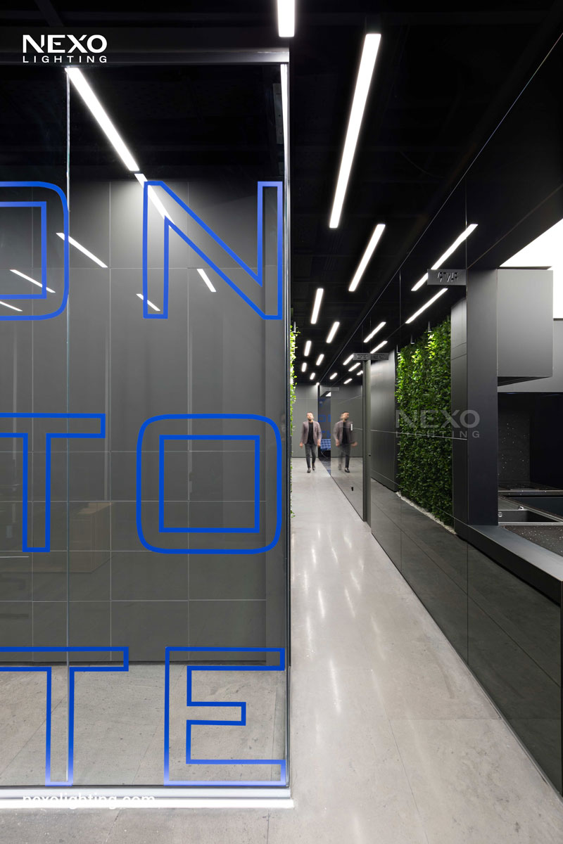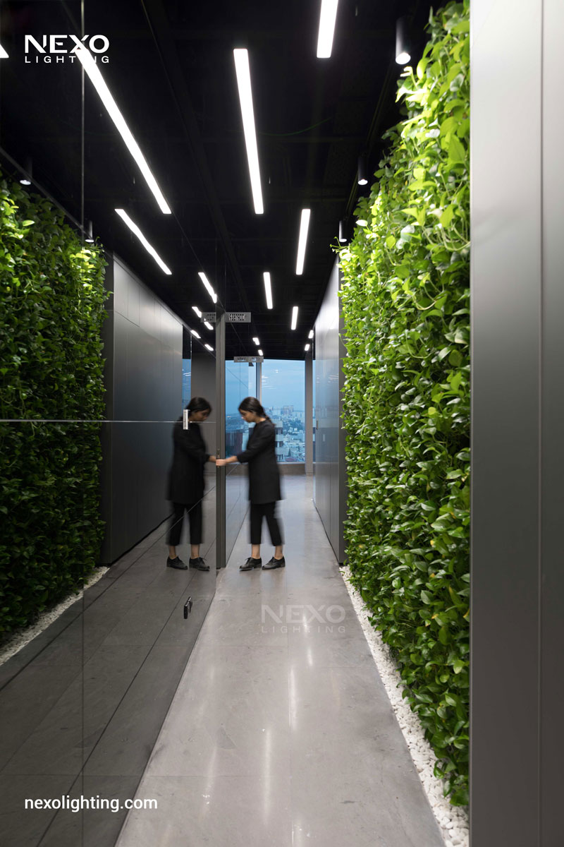 In this project, the ceiling lighting consists of partially linear lights, enhancing the spatial dynamics through their rhythmic placement. This effect is particularly pronounced around the central box and the main aisle, where the reflected lines amplify the design.
