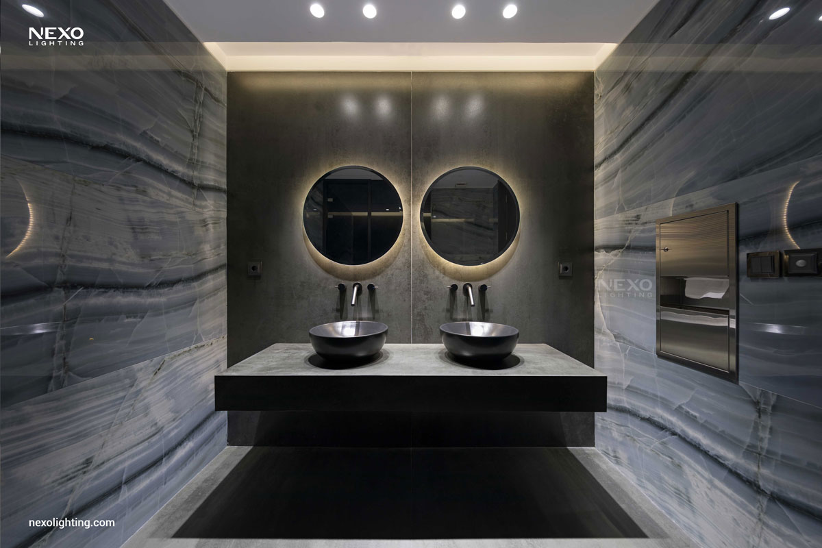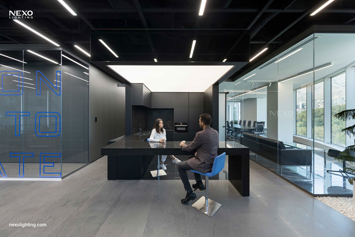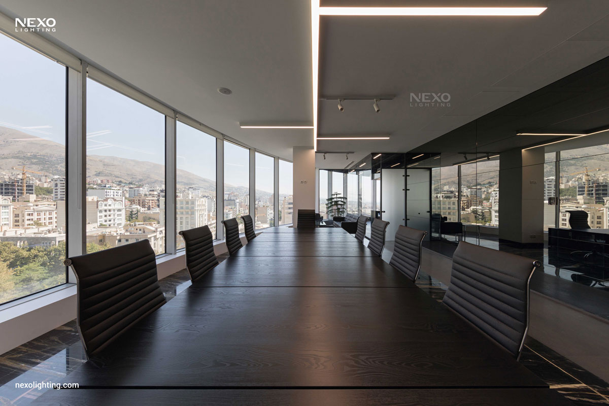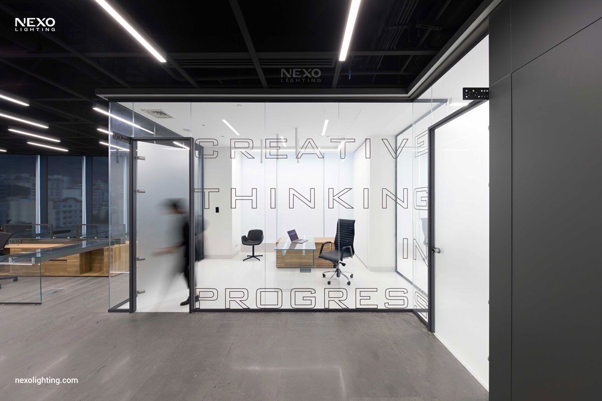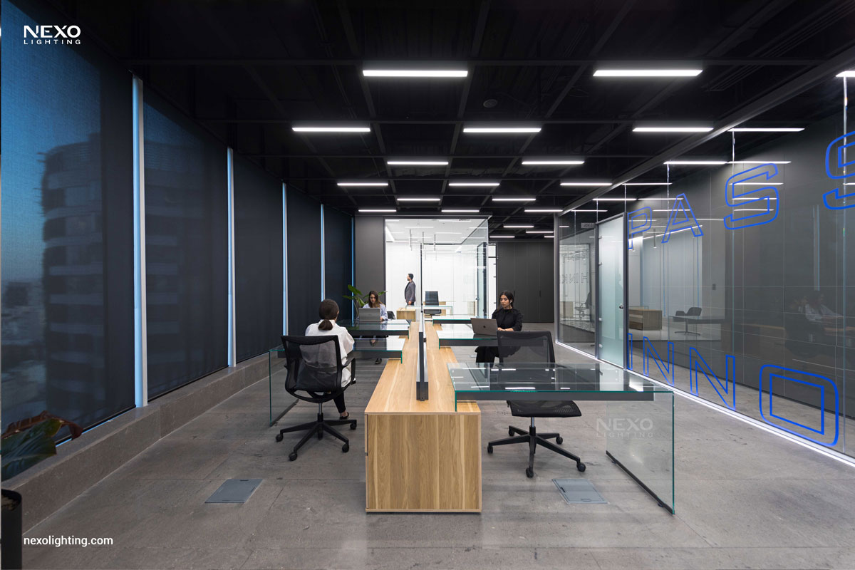 In this project, the ceiling lighting consists of partially linear lights, enhancing the spatial dynamics through their rhythmic placement. This effect is particularly pronounced around the central box and the main aisle, where the reflected lines amplify the design.
